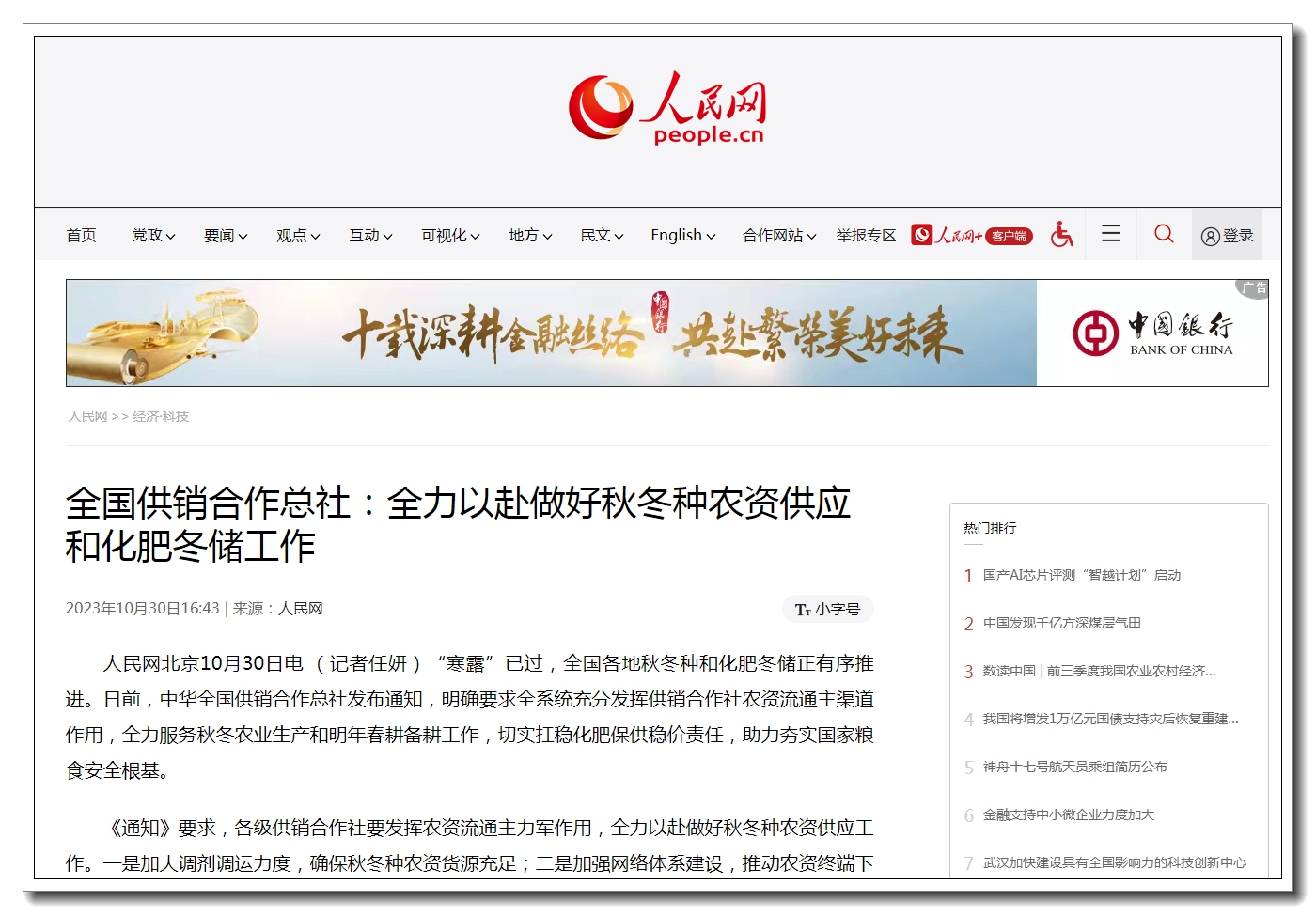 “寒露”已過(guò),全國(guó)各地秋冬種和化肥冬儲(chǔ)正有序推進(jìn)。日前,中華全國(guó)供銷合作總社發(fā)布通知,明確要求全系統(tǒng)充分發(fā)揮供銷合作社農(nóng)資流通主渠道作用,全力服務(wù)秋冬農(nóng)業(yè)生產(chǎn)和明年春耕備耕工作,切實(shí)扛穩(wěn)化肥保供穩(wěn)價(jià)責(zé)任,助力夯實(shí)國(guó)家糧食安全根基。