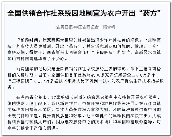 而肖建華的經(jīng)歷只是全國(guó)供銷(xiāo)合作社系統(tǒng)服務(wù)三農(nóng)的縮影。眼下正值春耕備耕的關(guān)鍵時(shí)期,目前,全國(guó)供銷(xiāo)合作社系統(tǒng)4500多家農(nóng)資經(jīng)營(yíng)企業(yè)、6萬(wàn)多個(gè)“莊稼醫(yī)院”、1.7萬(wàn)多名技術(shù)服務(wù)人員下沉到一線(xiàn),為農(nóng)戶(hù)提供生產(chǎn)技術(shù)指導(dǎo)服務(wù)。